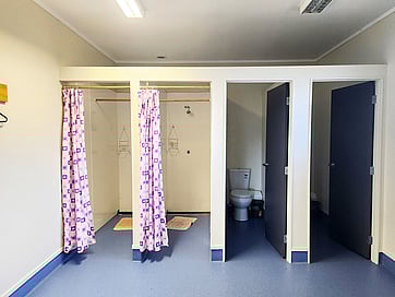 The Whare has two modern bathrooms, each with 2 showers, 2 toilets, and 2 basins. Guests bring their own toiletries, and the layout is practical and spacious to easily accommodate larger groups, ensuring everyone has what they need for a comfortable stay. The level floor layout is especially helpful for mobility (though not technically accessible). Bench seats are handy support for elderly and little ones. Cubbies and lots of hooks also helpful for hanging towels and wet gear.